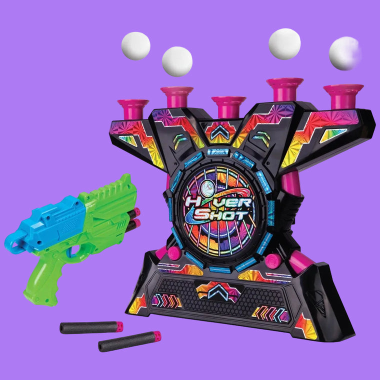 The HoverShot Aiming Toy™ is an interactive target game that uses a powerful airflow base to suspend five lightweight balls in mid-air. Players use the included foam-dart blaster to take turns knocking the hovering targets down, competing for the highest score. It’s an exciting game of skill for indoor fun.