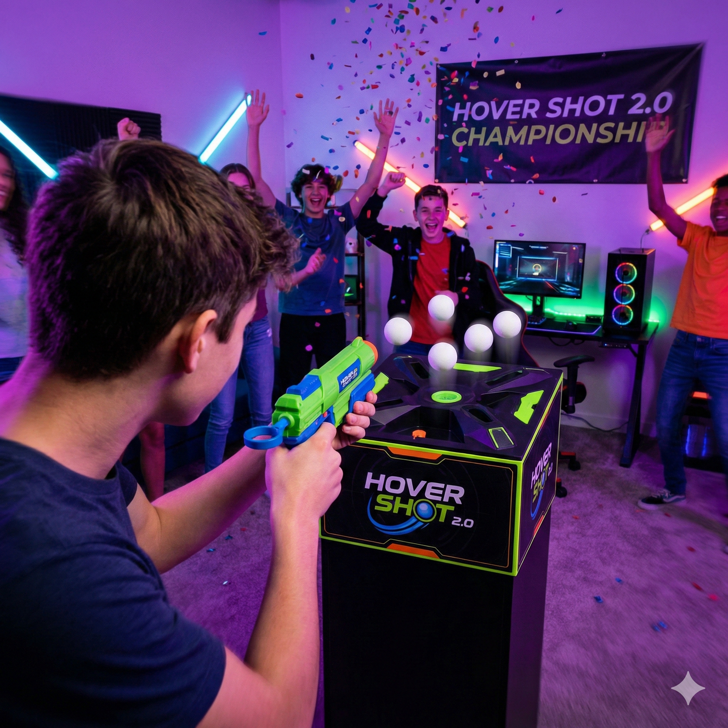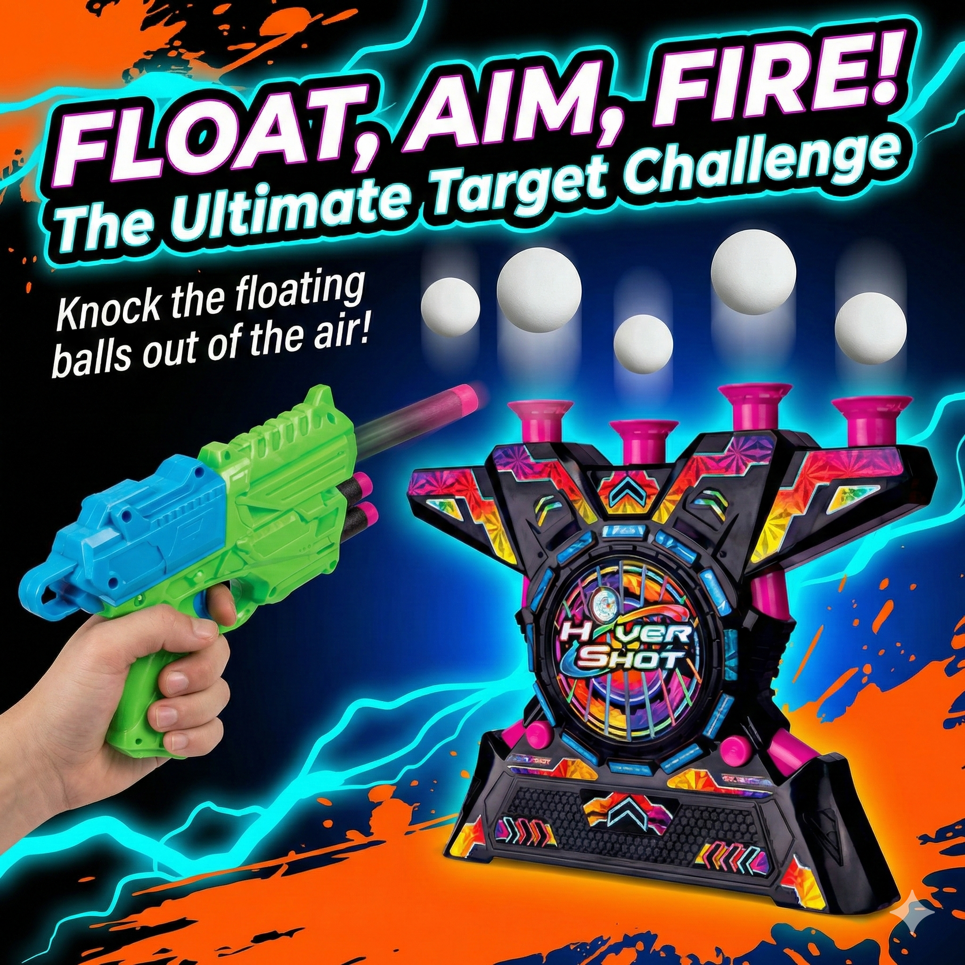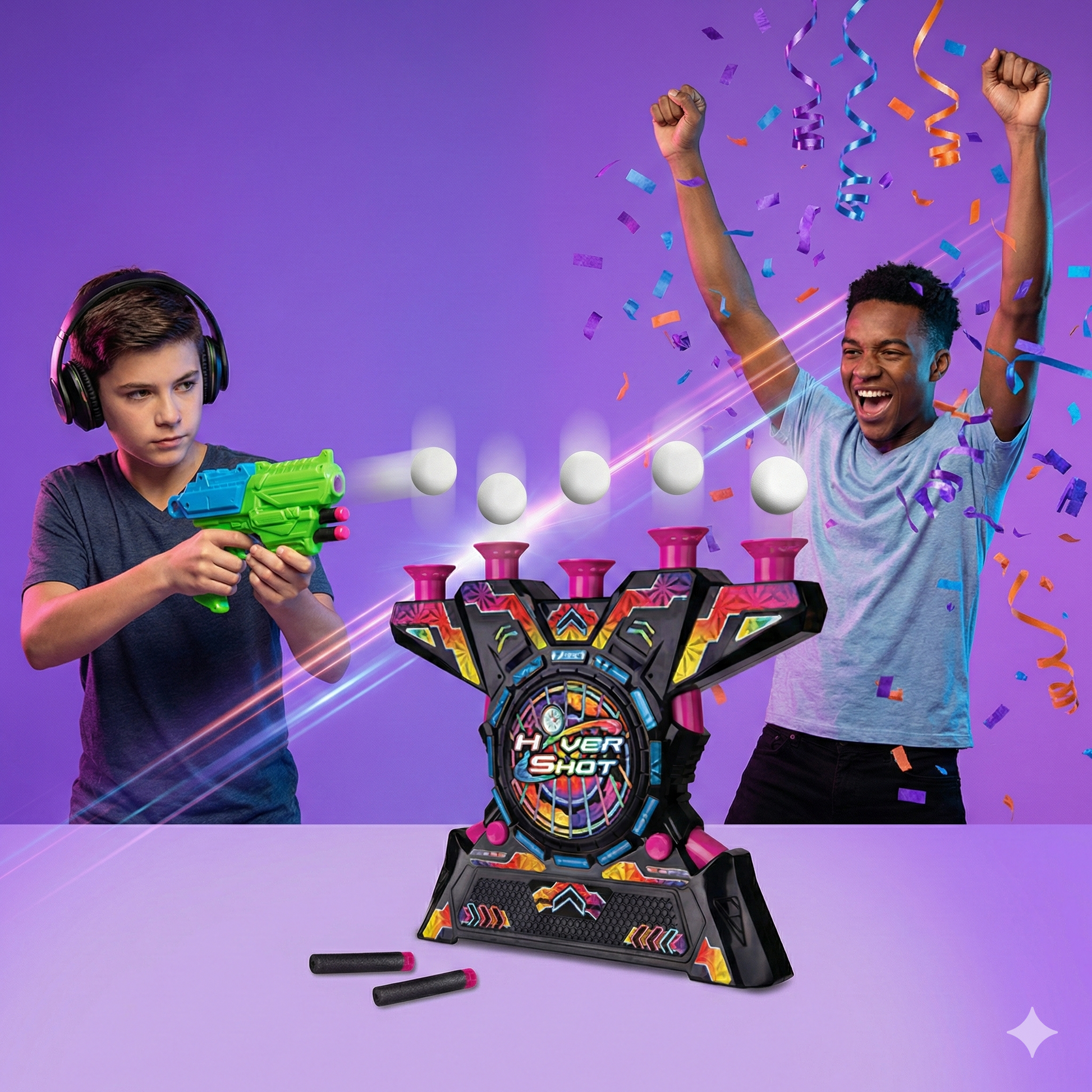 "Enjoy the thrill of a target-shooting competition without needing a dedicated game room. Our portable hover-set lets you bring the action along for the fun perfect for playrooms, parties, basements, or simply moving the challenge from room to room. Light, quick to set up, and instantly engaging. Turn any flat surface into an instant competitive arena!"