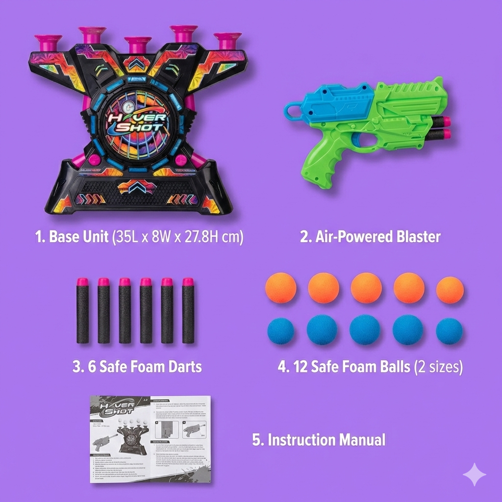 You will receive: 1 HoverShot™ base unit, 1 foam-dart blaster, 5 hover balls (glow-in-the-dark), multiple foam darts, and any necessary clips or accessories as per the model. (Batteries are typically required but not included).